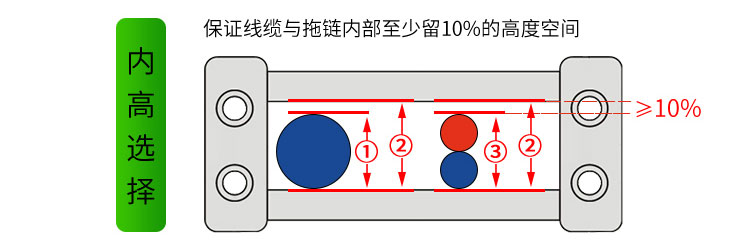 (拖鏈內(nèi)高②)≥(線纜直徑①)*10%,若重疊按(重疊后實(shí)際高度③)作為線纜直徑