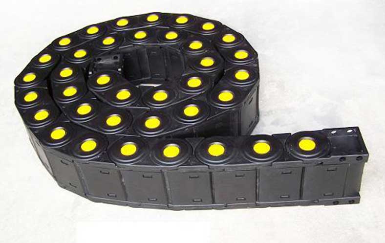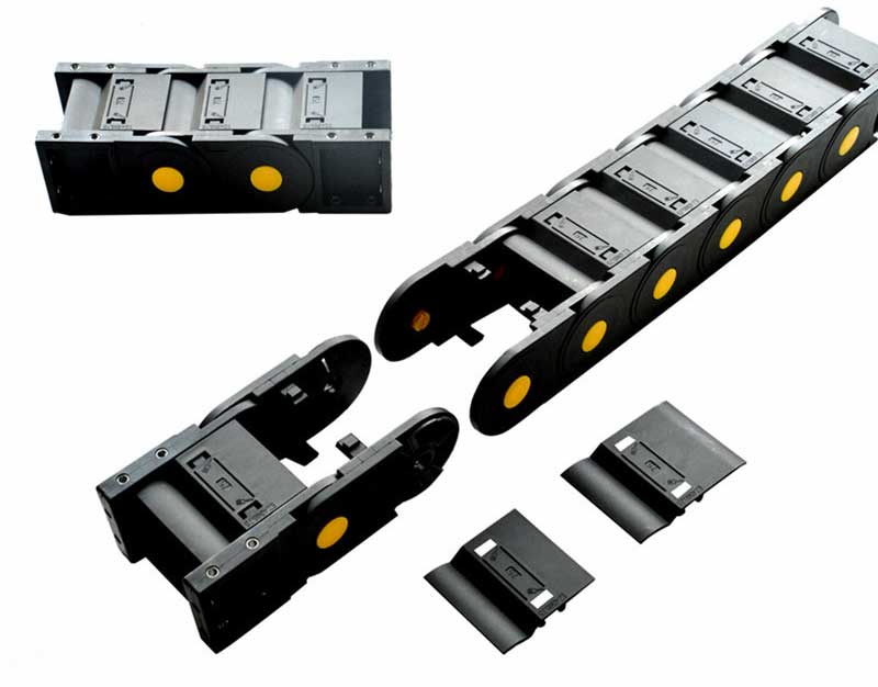 全封閉式工程塑料拖鏈每節都能打開,便于安裝和維修,運動的噪音低、耐磨、可高速運動。耐磨、耐高溫、不變形、低噪音、裝拆靈活、壽命特長。最高速度可達5米/秒,最高加速度可達5米/秒(具體速度、加速度視運行情況而定)。