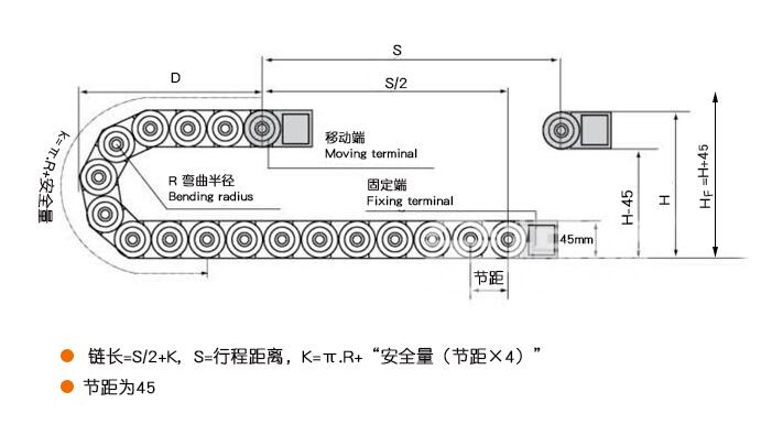 拖鏈彎曲后的總高度=彎曲半徑x2+外高