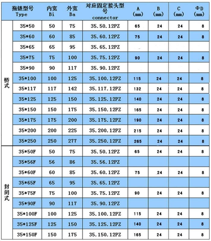 35系列工程塑料拖鏈規格(四片裝可打開):